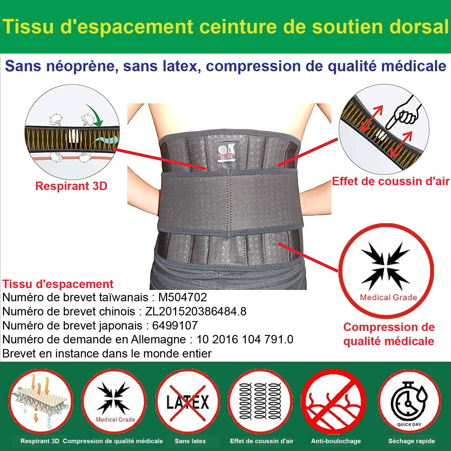 Nos supports sont tous fabriqués en tissu d'espacement. Le tissu d'espacement doit être l'un des meilleurs matériaux au monde pour les appareils orthopédiques sportifs et médicaux. Seul le tissu d'espacement a un effet de coussin d'air. La plupart des tissus d'espacement disponibles sur le marché ne sont pas assez compressifs. Nous utilisons notre technique brevetée pour fabriquer un tissu d'espacement de compression de qualité médicale.